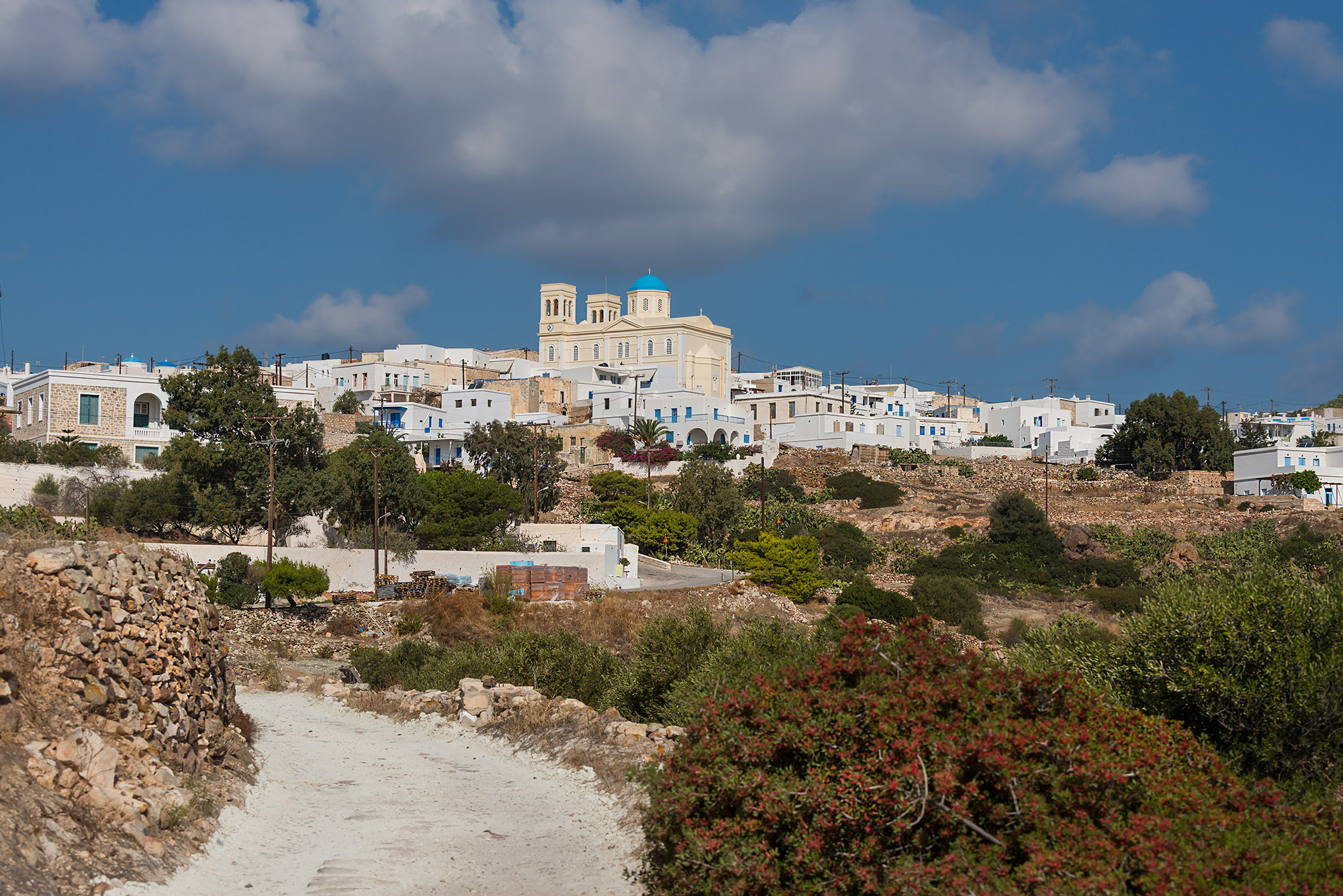 Chorio, the island¢s capital, is built in the southeast part of Kimolos 1km from the port. It is consisted by two settlements, Mesa Kastro and Exo Kastro, which communicate to each other by four entrances - passages, the so-called Portares. Mesa Kastro is built around the center of the medieval castle. The outdoor walls of old houses are merged and create the fort of the castle. It is a characteristic sample of the Aegean architecture of fortresses. Narrow cobblestone pavements and many churches comprise the scenery of this settlement that takes visitors back to past times. Another characteristic of Chorio is the existence of many churches. Small graphic churches and grandiose temples attract the attention. Among them distinguishes the church of Christ, which according to the inscription was built in 1952. The settlement of Exo Kastro was built in the 17th century and extends around the Castle¢s fortifications. Its architecture is plain and stays tune to the tradition of Cyclades islands. Touring around the village will be unforgettable. The pictures you will see will give you beautiful photographs in your photo album. While exploring the island, in location Ellinika you will see the remains of the ancient town. In region Prasa kimolia is being excavated, one of the basic ingredients to make porcelain. In Chorio you will find rooms to let. In the taverns you will taste the traditional cuisine and at night you will enjoy your drink viewing the castle and Aegean Sea.